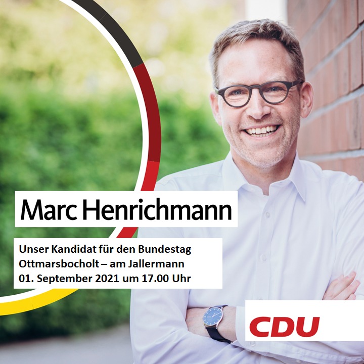 Unser Bundestagskandidat Marc Henrichmann besucht am Mitttwoch, den 01. September um 17.00 Uhr Ottmarsbocholt. Am Jallermann möchten wir allen interessierten Bürgern die Möglichkeit geben mit Marc Henrichmann ins Gespräch kommen. In lockerer Runde besteht die Möglichkeit Marc Henrichmann Fragen zu stellen, sowie über aktuelle Themen und dem Wahlprogramm der CDU zu diskutieren! Wir freuen uns auf eine interessante Gesprächsrunde!